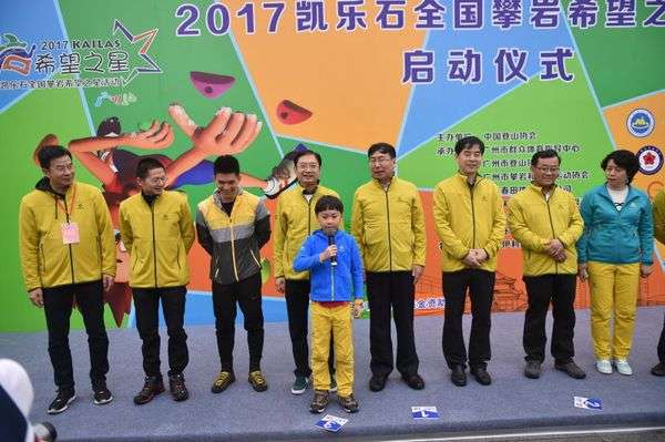 (啟動儀式上登協(xié)領(lǐng)導(dǎo)與小學(xué)員合影)2017年3月25日,2017年凱樂石全國攀巖希望之星活動暨廣州站邀請賽歡樂啟幕,啟動儀式在廣州天河體育中心舉辦,國際攀聯(lián)副主席、中國登山協(xié)會主席李致新及廣東省體育局局長王禹平、廣州市體育局局長羅京軍等一眾領(lǐng)導(dǎo)出席了啟動儀式。(圖1,登協(xié)領(lǐng)導(dǎo)在啟動儀式上,后排左五為李致新)另外,2015年度國際攀聯(lián)世界杯總冠軍鐘齊鑫作為特邀嘉賓也出席了該儀式。150名來自全國各地...