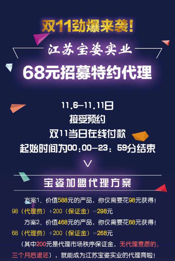 這、這、這、這是真的么?老板大放血?原來,雙11來了啦!考考你,68元在雙11當(dāng)天能升值到多少?68元可以換取價值468元的商品,你要不要?68元可以讓你加盟實(shí)業(yè),開啟創(chuàng)業(yè)之路,你要不要???68元讓你終生享受鉆石VIP會員待遇,寶姿產(chǎn)品價格折上折,你要不要????雙11,老板和老板娘都不在家,寶姿微商憋了好久,放大招!!!快快提前噪起來吧,雙11零點(diǎn)開搶啦。江蘇寶姿實(shí)業(yè),雙1168元招募特約代理...