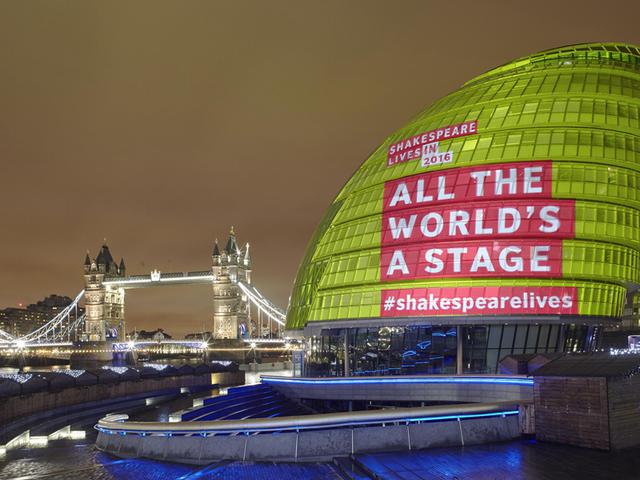倫敦市政廳響應(yīng)“永恒的莎士比亞”活動(dòng)。英國(guó)首相大衛(wèi)?卡梅倫今年是英國(guó)戲劇大師威廉·莎士比亞去世400周年。我們懷念他的偉大作品,也向他永存于世的影響力致敬。正如名劇《裘力斯·凱撒》中的臺(tái)詞,“他像一位巨人,跨越了這狹隘的世界”。莎翁的作品被翻譯成100多種語(yǔ)言,被全世界一半的學(xué)生誦讀,其傳播之廣,前所未有。同時(shí)代的劇作家本·瓊森曾說(shuō),“莎士比亞超越了時(shí)代,他將永世不朽。”今天,他仍然活在我們的語(yǔ)言...