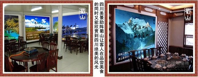 “蜀山”店面設(shè)計成宣傳四川美食、美景與蜀文化的窗口,店內(nèi)墻面布置的宣傳四川的風(fēng)景畫,讓食客在四川壯美的風(fēng)光中享受四川美食,濃郁的三國蜀文化,將蜀山的文化內(nèi)涵發(fā)揮到極至。在“蜀山”,我們聽得最多的是顧客的驚嘆“味道太好了!太有特色了!四川風(fēng)景太漂亮了”!蜀山——正以其特色的方式讓人們愛上四川,愛上四川美食,愛上四川美景。