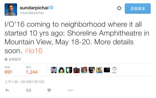 今天,Google現(xiàn)任CEO桑達爾·皮柴(SundarPichai)在Twitter上宣布了2016年開發(fā)者大會的召開日期和地點。I/O2016GoogleI/O2016將于今年5月18–20日召開。會場將位于總部所在地MountainView的ShorelineAmphitheater。這個地址也是十年前Google召開第一次開發(fā)者大會的地方。一般來說,每年全球科技界都有那么幾場“春晚”不能錯過...