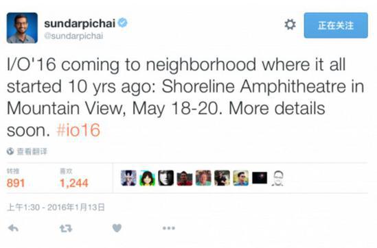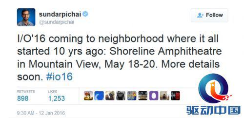 驅動中國2016年1月13日消息,谷歌CEO桑達爾·皮查伊(SundarPichai)在美國當?shù)貢r間12日正式宣布,一年一度的GoogleI/O開發(fā)者大會已定于在5月18日到20日召開。皮查伊發(fā)布Twitter的消息稱,此次2016I/O開發(fā)者大會的選址定在了山景城的ShorelineAmpitheatre圓形劇場。皮查伊表示這意味著此次大會將重返“10年前開始的社區(qū)”。值得注意的是,山景城(Mo...