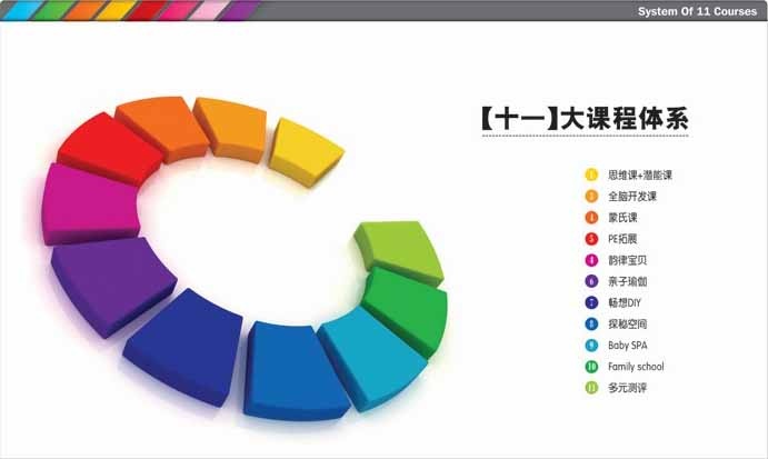 1.思維課&潛能課 2.全腦開發(fā)課 3.蒙氏課 4.PE拓展 5.韻律寶貝 6.Baby SPA