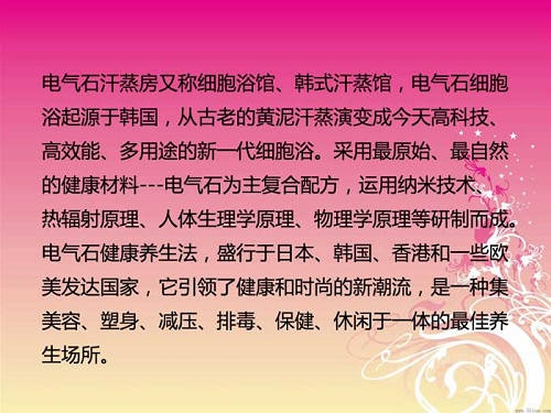 托瑪琳所釋放的微電源和負(fù)離子可作用于人體的神經(jīng)系統(tǒng),對(duì)神經(jīng)衰弱起到治療作用,微電流不僅可以影響人體的生物電,而且其本身可以引起離子濃度和其運(yùn)動(dòng)速度的變化,離子濃度高、運(yùn)動(dòng)速度快,被人體吸入后會(huì)緩解緊張的情緒。經(jīng)常的汗蒸有助于提高體溫調(diào)節(jié)機(jī)能,恢復(fù)和加強(qiáng)免疫力,刺激受到空調(diào)等現(xiàn)代生活影響而變得遲鈍的現(xiàn)代人的自律神經(jīng)。另外負(fù)離子能殺菌抑臭、清新空氣,給您帶來(lái)愉悅的心情。