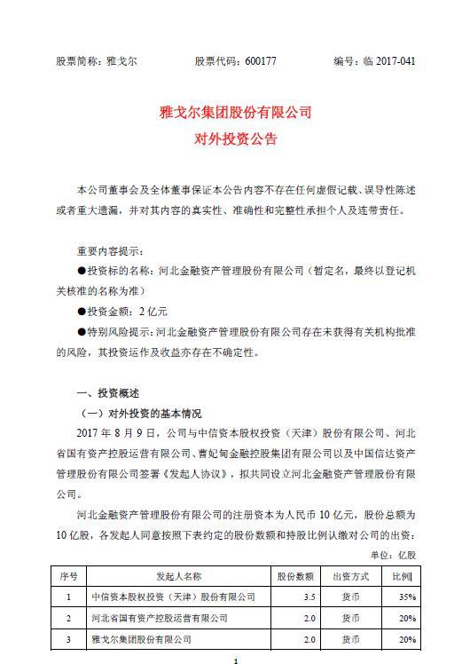 雅戈爾8月9日晚間公告,公司9日與中信資本股權投資(天津)股份有限公司、河北省國有資產(chǎn)控股運營有限公司、曹妃甸金融控股集團有限公司以及中國信達資產(chǎn)管理股份有限公司簽署《發(fā)起人協(xié)議》,擬共同設立河北金融資產(chǎn)管理股份有限公司,主要從事對未上市企業(yè)的投資、對上市公司非公開發(fā)行股票的投資、資管及相關咨詢服務。其注冊資本為10億元,公司認繳2億元,占股份總額的20%。曾幾何時,雅戈爾的金融投資業(yè)務是最大利潤...