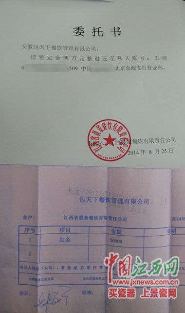 王先生要求包天下退還2萬元定金的委托書中國江西網(wǎng)訊記者報道:本欲找個品牌店加盟參與招標,不料投標竟失敗,交出去的2萬元定金也遲遲要不回來。近日,江西上饒市民王先生納悶了,自己的錢到底去哪兒啦?10月8日,王先生在中國江西網(wǎng)《安徽省蚌埠市包天下公司看自己是外地人,去退款時各種推脫,待材料寄去后,該公司的銷售經(jīng)理都一直聯(lián)系不上。背景:找加盟商參與招標據(jù)王先生介紹,前幾個月,他在上海鐵路局官網(wǎng)上看到了一...