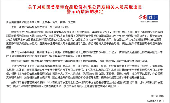 貝因美因業(yè)績預告不及時等被出具警示函