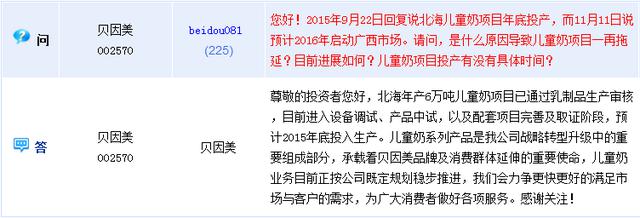 全景網11月23日訊貝因美(002570)周一在全景網互動平臺上回答投資者提問時透露,北海年產6萬噸兒童奶項目已通過乳制品生產審核,目前進入設備調試、產品中試,以及配套項目完善及取證階段,預計2015年底投入生產。公司介紹,兒童奶系列產品是公司戰略轉型升級中的重要組成部分,承載著貝因美品牌及消費群體延伸的重要使命。兒童奶業務目前正按公司既定規劃穩步推進。貝因美主營嬰幼兒食品的研發、生產和銷售等業務...