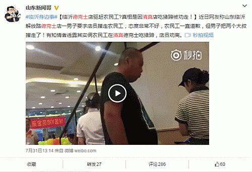 山東臨沂德克士員工攆走農(nóng)民工 因嫌其惡心