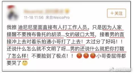 【素質(zhì)太差!網(wǎng)爆迪士尼有人拔“布魯托”胡須,被勸阻后毆打樂拍通小哥】11月18日,網(wǎng)友爆料:上海迪士尼里有人毆打工作人員,原因竟然是肇事者被工作人員提醒,不要拽布魯托的胡須。根據(jù)網(wǎng)友描述,肇事的一男一女不僅理虧還態(tài)度蠻橫,“女的破口大罵,男的直接對樂拍通小哥打了上去!還說:把你打瞎又怎么樣!”這件事情被曝光后,網(wǎng)友紛紛吐槽,你怎么看?...