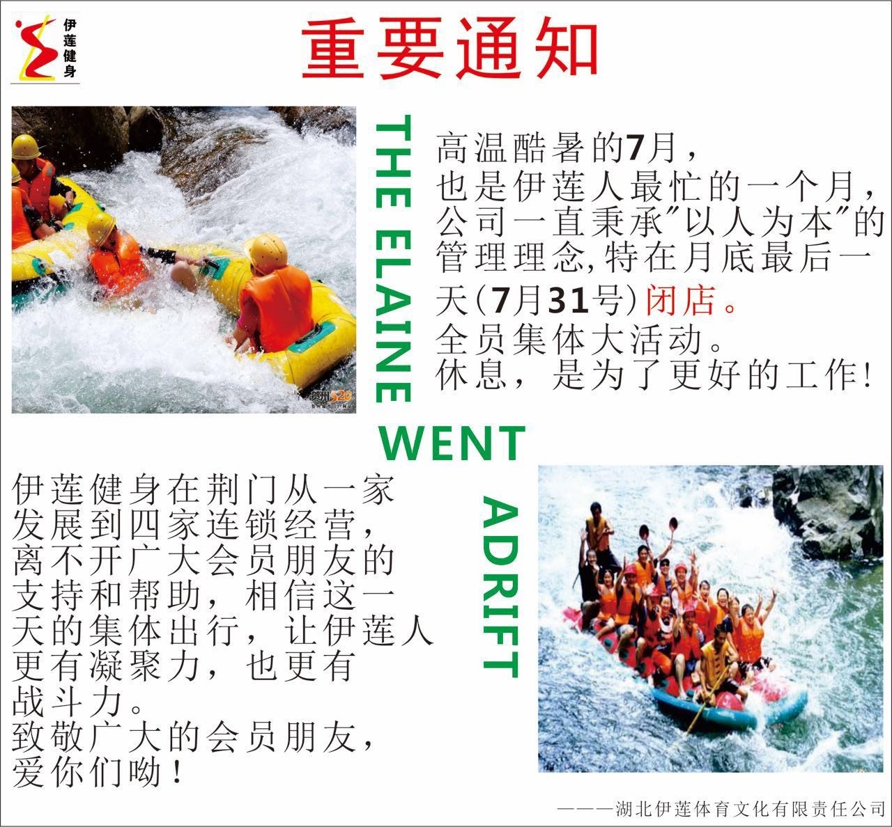 伊蓮健身7月31日(星期一)閉店通知