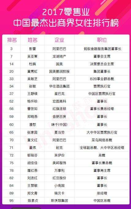 2月6日,福布斯中國發布“2017中國最杰出商界女性排行榜”。在福布斯中國公布的這份榜單中,格力電器董事長董明珠奪得榜首,集團華為董事長孫亞芳與螞蟻金服董事長彭磊分居二三位,該榜單共有100位內地商界女性入選。記者經過查詢發現,共有21位涉足零售行業的內地商界女性入選,其中阿里巴巴共有3位女性入選,分別螞蟻金服董事長彭蕾、B2B事業群總裁吳敏芝和菜鳥網絡總裁童文紅。國美有2位女性入選,分別是國美決...