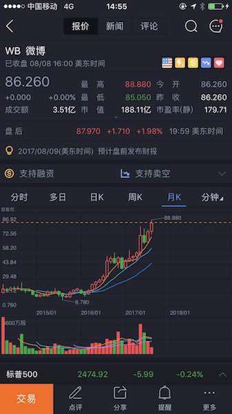 原標題:紅豆微課上線,語音直播+知識付費會是好生意嗎?從微博最近的股價說起。2016年以來,微博股價從低谷期的12美元漲到今天的86.26美元,漲幅超過7倍,當所有人都認為其股價已經很高后,它還在不斷創造驚喜。剛剛過去的交易日再度上漲9.51%,市值達到184.20億美元的峰值,盤中最高達到190億美元,距離200億美金市值俱樂部只有一步之遙。微博迎來第二春,內容戰略是最大功臣。其內容戰略可分為兩...