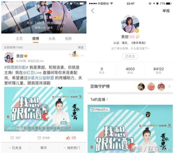 7月5日,人氣女演員景甜獻聲紅豆Live語音直播,參與由紅豆Live與微公益、星光公益聯盟聯合發起的“我想和你配”大型公益直播活動。在直播中,景甜一改女神形象,非常放松、接地氣的與粉絲聊天,更是連唱《水晶》、《告白氣球》、《晴天》等多首歌曲,不僅進一步的拉近了與粉絲的距離,更令很多網友路轉粉。此次景甜直播最終的連麥收入與禮物打賞將全部通過微公益平臺捐贈給中國聽力醫學發展基金會,援助80萬聽障兒童。...