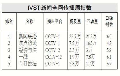 \u00A0\u00A0\u00A0\u00A0在本周新聞節目全網傳播指數排行榜中,《新聞聯播》等眾多新聞欄目大篇幅報道慶祝香港回歸祖國20周年大會暨香港特別行政區第五屆政府就職典禮相關內容,舉國歡慶,民眾歡欣鼓舞。《焦點訪談》推出《香港故事》系列節目,集中展現香港回歸后日新月異的繁榮面貌,以及與內地攜手前行的和諧發展盛況,同樣吸引大批民眾目光。\u00A0\u00A0\u00A0\u00A0在本...