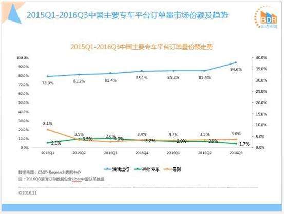 11月17日,中國IT研究中心(CNIT-Research)發布《2016年中國專車市場研究報告》,報告顯示,今年三季度,我國專車市場整體規模繼續增長。其中,滴滴出行專車活躍用戶覆蓋率占比達96.7%,訂單量市場份額報94.6%,兩指標均以絕對優勢穩居首位,易到用車、神州專車則分別排二、三名。具體來看,易到用車Q3活躍用戶覆蓋率達14.3%,市場份額報3.6%,雙雙小幅增長,而神州專車Q3活躍用戶...