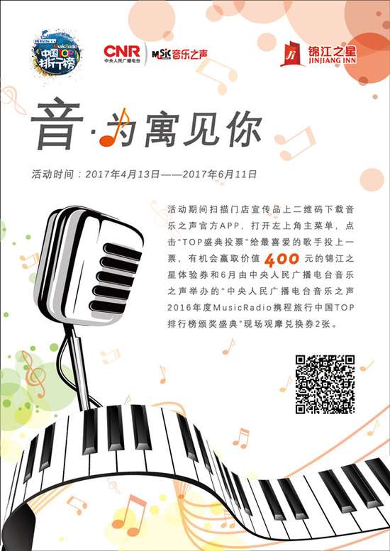 日前,由中央人民廣播電臺主辦、中央人民廣播電臺音樂節(jié)目中心承辦的2016年度“MusicRadio攜程旅行中國TOP排行榜頒獎盛典”啟動記者會在北京明星基地舉行,現(xiàn)場揭曉了“年度最受歡迎系列”部分入圍獎項,開啟了歌迷投票通道。錦江之星積極助陣票選,推出了“音·為寓見你”主題活動,為廣大歌迷帶來驚喜福利。4月13日起至6月11日前往全國任一錦江之星連鎖酒店,掃描前臺二維碼,下載“音樂之聲”官方APP...