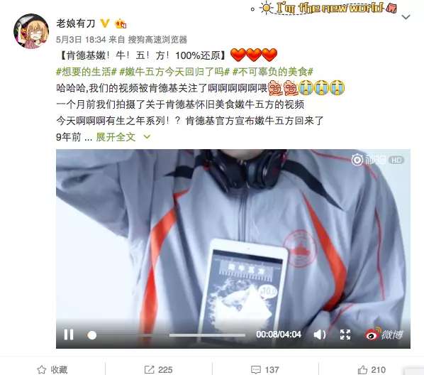 肯德基宣布重新上架“嫩牛五方”,還是一樣的川辣口味,還是9年前上市時候的單品價格,限時上架三周時間。從社交網絡的反響來看,這款2008年上市、2012年下架的產品引發了不少人的懷念。肯德基的官方廣告片里也重點使用了這個懷念梗??廣告歌《我要!我要!嫩牛五方》的每一句歌詞都來自于網友熱評,并且在廣告中一一標注出來,看起來還蠻討巧的。這支5月2日上線的視頻目前在騰訊視頻上的點擊量超過334.7萬。拍攝...