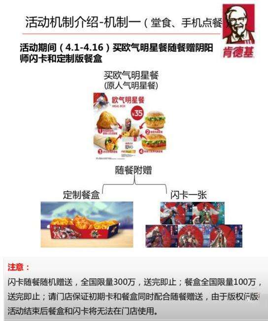 陰陽師限量閃卡已經(jīng)上架肯德基,那么陰陽師限量閃卡活動(dòng)有什么獎(jiǎng)勵(lì)呢?今天,小編就給大家?guī)黻庩枎熛蘖块W卡活動(dòng)獎(jiǎng)勵(lì)一覽,希望能夠幫助到大家。4月1日-16日活動(dòng),購買歐氣明星餐(價(jià)格未知),附贈(zèng)定制餐盒和閃卡一張.閃卡:一張有陰陽師式神圖鑒的卡,包含現(xiàn)世召喚符咒(100%中獎(jiǎng),隨機(jī)1、2、3、5、7張)boss團(tuán):LBS地圖活動(dòng),擊敗獲取獎(jiǎng)勵(lì)。目前肯德基已經(jīng)放上了陰陽師的式神,包括了:妖琴師、青坊主、...