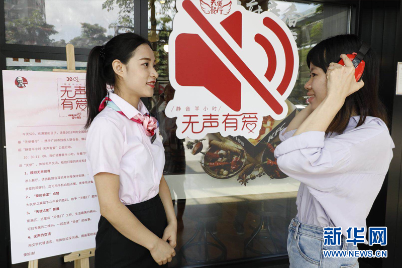 \u00A0\u00A0\u00A0\u00A05月20日是第28個全國助殘日,廣東肯德基聯(lián)合廣州市殘疾人聯(lián)合會、佛山市殘疾人聯(lián)合會等多家知名社工機(jī)構(gòu),共同發(fā)起“靜音半小時?無聲有愛”公益行動。讓市民一起走近“天使”,體驗(yàn)無聲交流,給他們愛的肯定和鼓勵。\u00A0\u00A0\u00A0\u00A0參與者體驗(yàn)無聲。新華網(wǎng)發(fā)\u00A0\u00A0\u00A0\u00A0活動期間,餐廳關(guān)閉了背景音...