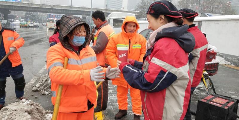 大雪紛飛送溫暖 肯德基西安街頭慰問環(huán)衛(wèi)工人