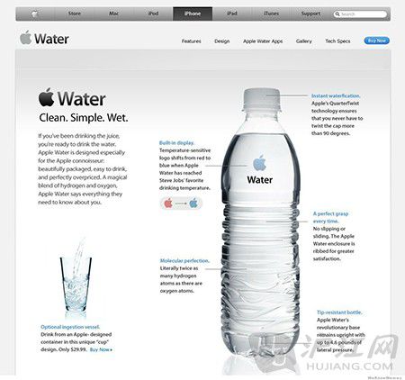 如果你一直在喝果汁,那你一定非常樂意嘗試一下這個純凈水。AppleWater就是專門為使用蘋果公司產品的內行人士量身定制的:漂亮的包裝,簡單的方式,完美的高價。氫與氧的完美結合,AppleWater可以說能滿足你所有的需要。可選擇的飲水容器:用這個蘋果特制的杯子來喝水吧,只需2.99美元。內置顯示:帶有內置溫度感應器的蘋果圖標,在水溫達到SteveJobs最喜歡的水溫時,就會從紅色轉變?yōu)樗{色。完美...