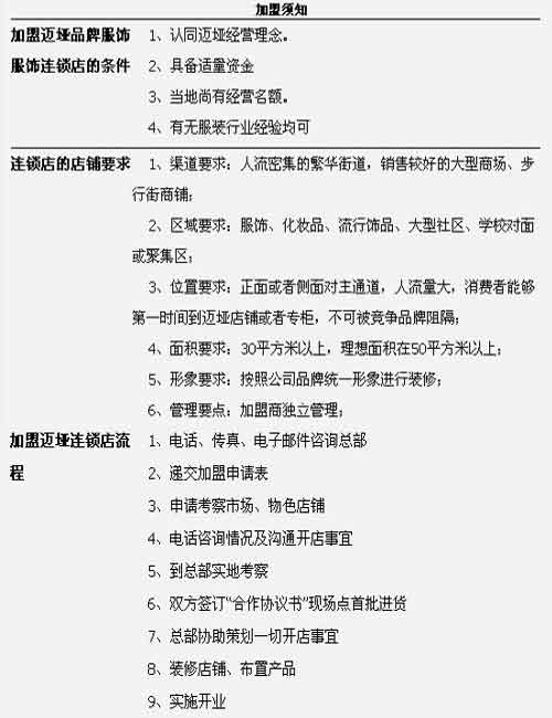 品牌會員店,俗稱服裝超市、服裝大賣場。直觀的說,就是類似于“國美”、“蘇寧”這種經(jīng)營方式,只不過是產(chǎn)品換成了服飾。這是當今國際上最流行的營銷模式。但這種最新興起的服裝業(yè)態(tài),通常是大的投資集團公司直接經(jīng)營,不接受加盟,也就是不愿意給中小投資者分一杯羹的機會。而近兩年流行一時的品牌折扣店,由于產(chǎn)品款式、面料的陳舊,還有斷碼、瑕疵等原因,已不再吸引消費者的眼球,并且很容易造成加盟商的貨品積壓,在經(jīng)過市場的洗禮后,已經(jīng)不再風光無限。那么那些立志要在服裝行業(yè)發(fā)展,并實現(xiàn)賺錢目標的中小投資者們,該如何選擇呢?有鑒于此,邁埡集團高層抓住時機、果斷決策,決定將品牌會員店這種新興業(yè)態(tài)移植到中國。于是Maia邁埡國際品牌服飾會員店連鎖機構(gòu)應運而生了,她置身于中國改革開放的最前沿陣地,同時也是中國、乃至世界服裝生產(chǎn)的集散地——廣州,并構(gòu)建了一支強大的服務團隊,可以說是占盡了天時、地利、人和。Maia邁埡國際品牌服飾會員店連鎖機構(gòu)在創(chuàng)立之初,便以極高的規(guī)格奠定其王者風范,以其國際化背景、先進管理模式,推出風行全球的——量販式經(jīng)營模式。