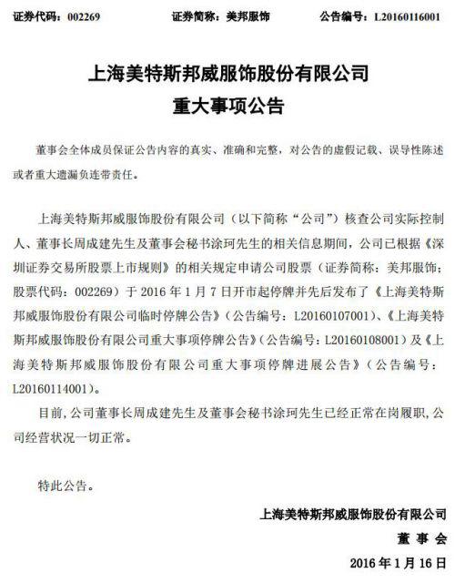 溫都訊昨天下午,上海美特斯邦威服飾股份有限公司董事會發(fā)布重大事項公告稱:公司董事長周成建先生及董事會秘書涂珂先生已經(jīng)正常在崗履職,公司經(jīng)營狀況一切正常。不過,公司股票(證券簡稱“美邦服飾;股票代碼002269)依舊處于停牌狀態(tài)。1月6日下午,坊間流傳美邦服飾董事長周成建被調(diào)查的消息。美邦董事會隨即于7日上午發(fā)布公告稱,因媒體上出現(xiàn)關(guān)于上海美特斯邦威服飾股份有限公司實際控制人、董事長周成建的相關(guān)信息...