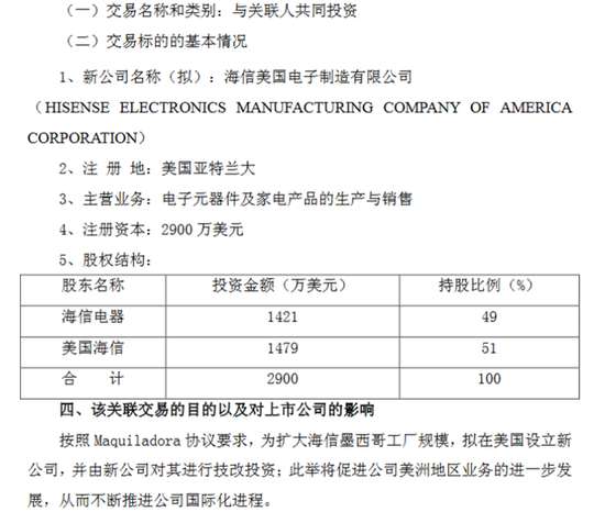 (原標題:海信電器:擬投資近1500萬美元擴大墨西哥工廠)海信電器晚間發布公告稱,為擴大海信墨西哥工廠規模,公司與關聯方美國海信擬共同投資2900萬美元,在美國設立海信美國電子制造有限公司,由新公司對海信墨西哥工廠進行技改投資。其中,海信電器擬出資1421萬美元,占比49%。公司稱,按照Maquiladora協議要求,為擴大海信墨西哥工廠規模,擬在美國設立新公司,并由新公司對其進行技改投資,此舉將...