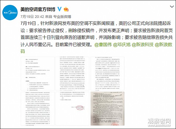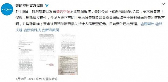 7月16日下午,新浪網(wǎng)刊發(fā)了一則“疑似美的空調(diào)機(jī)柜自燃導(dǎo)致35歲體育記者中毒死亡”的報(bào)道,瞬間引發(fā)廣泛關(guān)注并四處傳播,但后經(jīng)證實(shí),逝者不幸離世與空調(diào)和美的品牌沒有任何關(guān)系。美的空調(diào)也發(fā)布官方聲明,強(qiáng)烈譴責(zé)新浪網(wǎng)刊登不實(shí)報(bào)道,并要求新浪網(wǎng)刪除相關(guān)不實(shí)報(bào)道、采取合理措施消除負(fù)面影響、防止類似事件再次發(fā)生,否則將采取法律措施追究法律責(zé)任。昨日晚間,美的官方宣布,針對新浪網(wǎng)發(fā)布美的空調(diào)不實(shí)新聞報(bào)道,美的公...