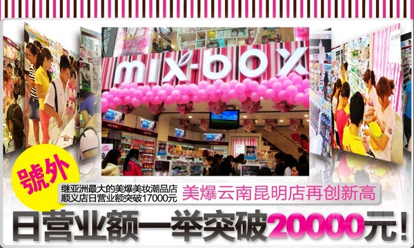 MIX-BOX(美爆)集聚卓絕、創(chuàng)意流行,融匯國際時尚思潮,主要受眾人群鎖定為14-26歲的潮人型女,將流行飾品、化妝品、化妝工具、玩具、 時尚小物品類集合,為顧客提供多次元時尚商品,以迎合不同潮族需要。帶著對快速時尚的理解與演繹,MIX-BOX(美爆) “飾”不可擋,正在成為炙手可熱的潮流集散地!