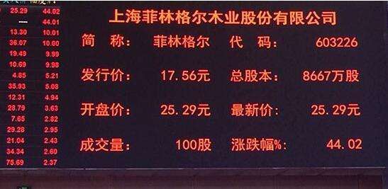 綜合整理/騰訊家居、金融之家2017年5月12日,上海菲林格爾(行情603226,診股)木業(yè)股份有限公司(下稱“菲林格爾”,股票代碼“603226”)正式登陸上交所。開盤首日,菲林格爾大漲44.02%,報(bào)收25.29元/股。據(jù)悉,此次菲林格爾發(fā)行不超過(guò)2167萬(wàn)股,占發(fā)行后總股本比例不低于25%。本次發(fā)行全部為公司公開發(fā)行新股,不安排公司原有股東公開發(fā)售股份。發(fā)行后總股本不超過(guò)8667萬(wàn)股。丁福如...