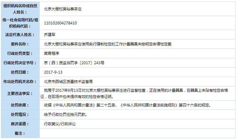 北京大柵欄吳裕泰茶莊因計量器具未檢定被質監(jiān)局罰款50元