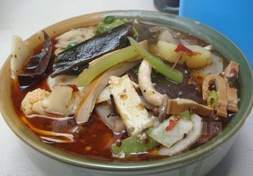 冒菜,成都的特色菜,常見的成都市井美食,川西平原特有的風(fēng)味小吃。冒菜就是將各種菜品統(tǒng)一裝在一個(gè)簍子里在湯料鍋中煮熟,然后將煮熟的菜再用各種拌菜料拌勻裝入碗中,舀入一定量的底湯交與食客食用的菜。其價(jià)格便宜,麻辣鮮香,既解饞又下飯。冒菜鍋里煮菜的水采用大骨熬制成高湯,因此冒菜的湯可以喝,其味道鮮香無比,而火鍋湯是無人敢送到嘴里喝的,這也是冒菜的特色。